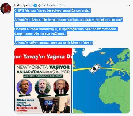 Resmi sosyal medya hesabından paylaşımda bulunan AK Parti Genel Sekreteri ve Ankara Milletvekili Fatih Şahin, “CHP'li Mansur Yavaş belediyeyi arpalığa çevirmiş! Ankara'ya hizmet için harcanması gereken paraları yandaşlara akıtmış! Gözünü o kadar karartmış ki, Kılıçdaroğlu'nun ABD'de ikamet eden danışmanını bile maaşa bağlamış. Ankara'yı yağmalamaya son ver artık Mansur Yavaş!” ifadelerine yer verdi.