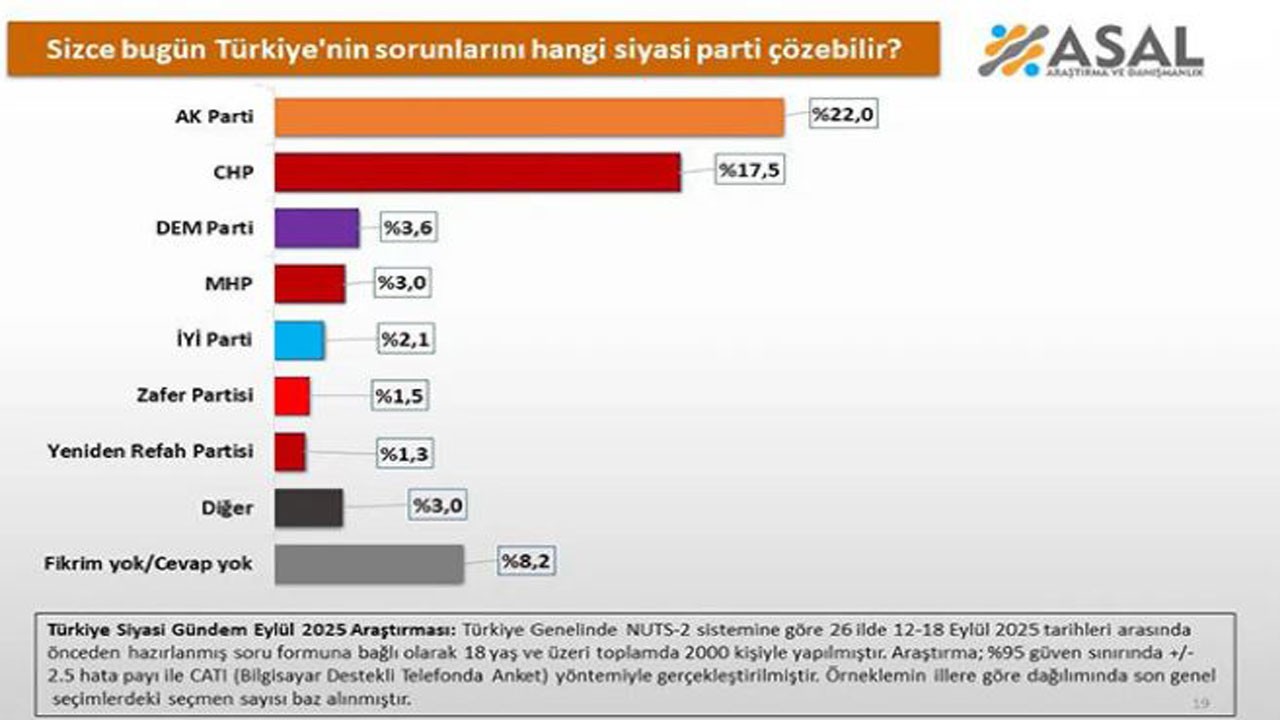 2 bin kişi ile eylül ayında yapılan çalışmada, Türkiye'nin en önemli sorunları ve bunu çözebilecek siyasi partiler soruldu.