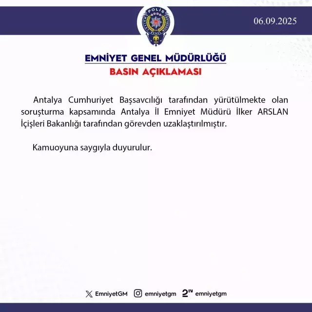 Emniyet Genel Müdürlüğü’nün açıklamasında, “Antalya Cumhuriyet Başsavcılığı tarafından yürütülmekte olan soruşturma kapsamında Antalya İl Emniyet Müdürü İlker Arslan, İçişleri Bakanlığı tarafından görevden uzaklaştırılmıştır” ifadeleri yer aldı. Soruşturmanın detaylarıyla ilgili bilgi paylaşılmadı.