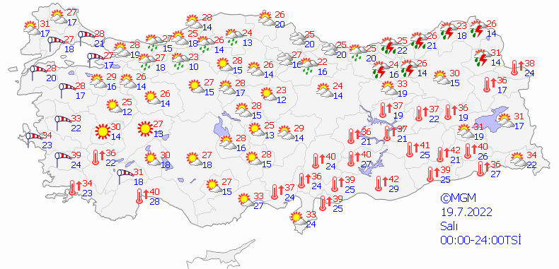 Antalya Valiliği, 19-25 Temmuz tarihleri arasında il genelinde yüksek sıcaklık uyarısı yaptı. Valilikten yapılan açıklamaya göre, sıcaklıkların Antalya il genelinde 19 Temmuz 2022 Salı günü ile 25 Temmuz Pazartesi günü akşam saatlerine kadar sahil kesimlerinde 38 ila 44 derece, iç kesimlerde 32 ila 36 derece arasında olmasının beklendiği kaydedildi.