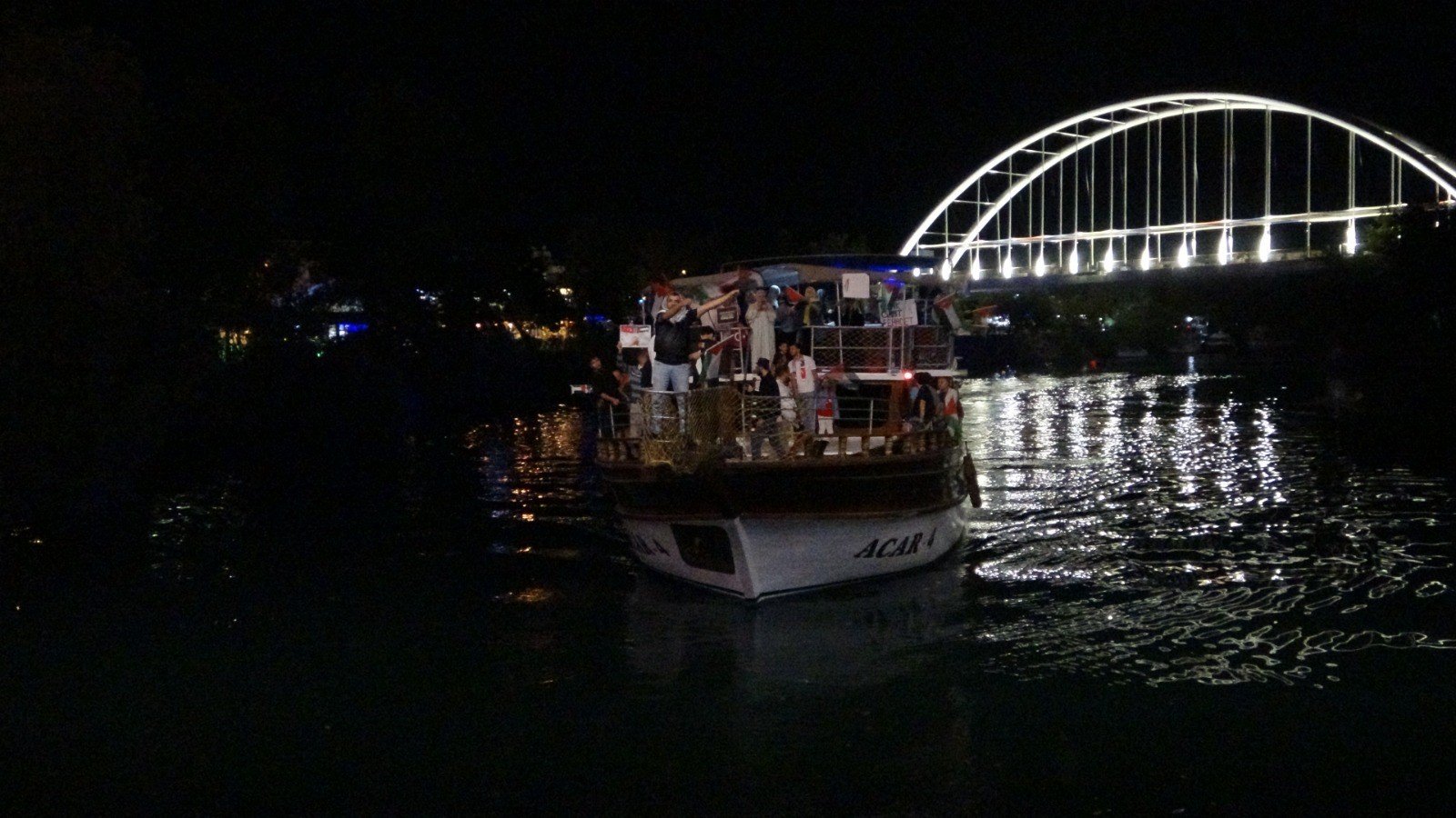 Manavgat Kudüs Platformu öncülüğünde bir araya gelen yaklaşık 100 kişilik grup, Külliye Camii’nde kılınan yatsı namazının ardından Manavgat Irmağı üzerindeki teknede sloganlar eşliğinde basın açıklaması yaptı ve dua etti.