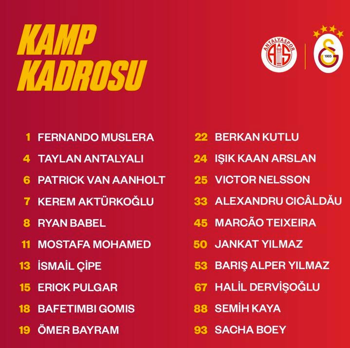 Süper Lig 'in son haftasında Antalyaspor'la karşılaşacak Galatasaray 'ın kadrosu belli oldu. Sarı-Kırmızılı ekibin Antalyaspor maçı kadrosuna Arda Turan kadroya dahil edilmedi.