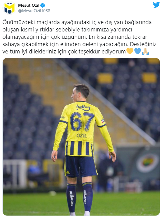 Fenerbahçe'nin Antalyaspor ile 1-1 beraber kaldığı maçta sakatlanan yıldız futbolcu Mesut Özil, sosyal medya hesabından yaptığı paylaşımla kötü haberi duyurdu.