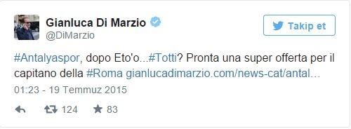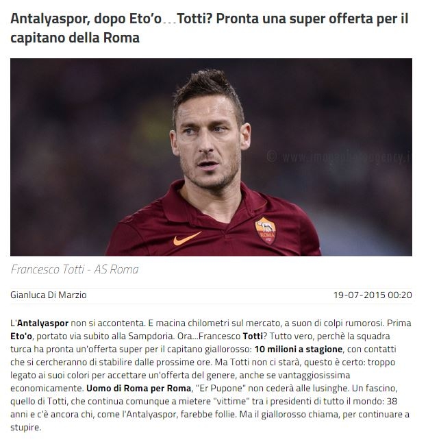 Verdiği transfer haberlerinin güvenilirliği ile tanınan Sky Sport’un İtalya Muhabiri Gianluca Di Marzio, Roma’nın efsanevi kaptanı 38 yaşındaki Francesco Totti’ye Antalyaspor’un yıllık 10 Milyon Euro teklifte bulunacağını iddia etti.