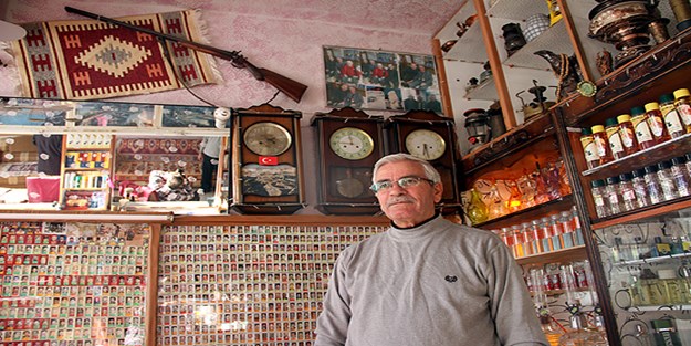 Gelen müşterilerin içeri girdiklerinde şaşkınlıklarını gizlemeyemedikleri dükkanda 1800'lü yıllardan günümüze kadar kullanılan aralarında çıra, lüküs, gaz lambası, pürmüz, tüfek, terazi, telefon, radyo, kahve öğütme makinesi, tarım aletleri, para ve karpit makinesinin de bulunduğu birçok eşya sergileniyor.