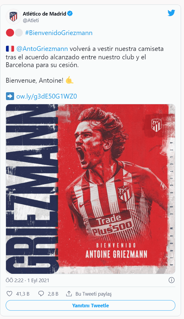 2019 yazında 120 milyon Euro bedelle Barcelona'ya transfer olan Antoine Griezmann, eski takımına geri döndü. Fransız yıldızın 2021-22 sezonunda kiralık olarak Atletico Madrid'e geçeceği ardından satın alma opsiyonu ile transferin biteceği iddia edildi.