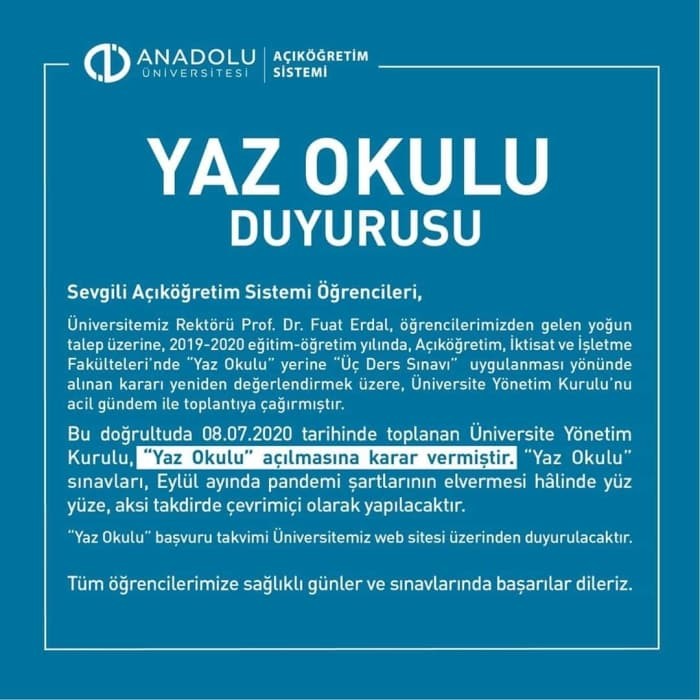 08.07.2020 tarihli karara göre yaz okulu tekrardan getirildi. 2019-2020 öğretim yılında, Açıköğretim, İktisat ve İşletme fakültelerinde üniversite yönetim kurulu "Yaz okulu" açılmasına karar verdi. Bu sebeple AÖF 3 ders sınavları kaldırıldı. Yapılan yazılı açıklama ise şu şekilde;