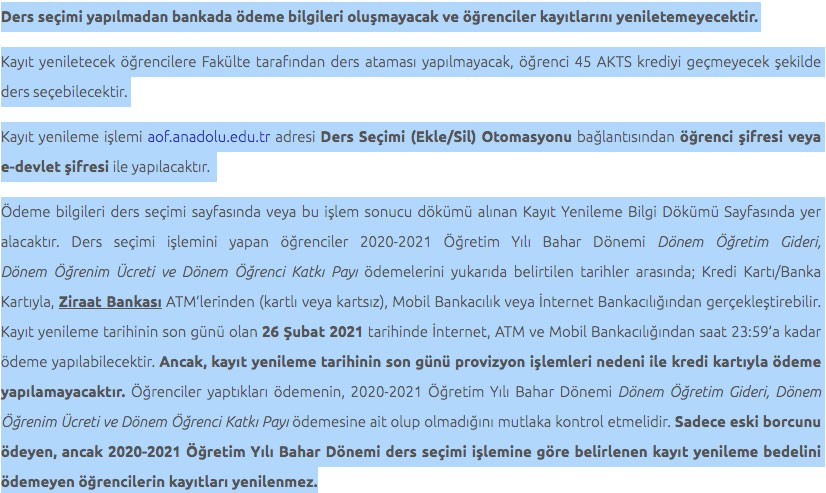 AÖF ders seçimi işlemini yapan öğrenciler 2020-2021 Öğretim Yılı Bahar Dönemi Dönem Öğretim Gideri, Dönem Öğrenim Ücreti ve Dönem Öğrenci Katkı Payı ödemelerini belirtilen tarihler arasında; Kredi Kartı/Banka Kartıyla, Ziraat Bankası ATM’lerinden (kartlı veya kartsız), Mobil Bankacılık veya İnternet Bankacılığından gerçekleştirebilecek. Öğrenciler, kayıt yenileme tarihinin son günü olan 26 Şubat 2021 tarihinde İnternet, ATM ve Mobil Bankacılığından saat 23:59’a kadar ödeme yapılabilecek. Sadece eski borcunu ödeyen, ancak 2020-2021 Öğretim Yılı AÖF Bahar Dönemi ders seçimi işlemine göre belirlenen kayıt yenileme bedelini ödemeyen öğrencilerin kayıtları yenilenmeyeceği uyarısı yapıldı.