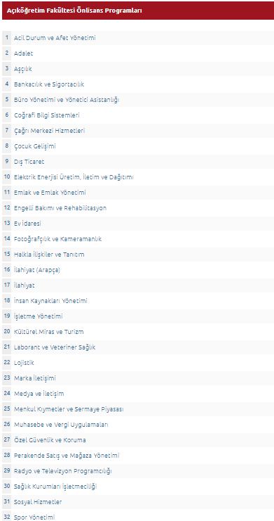 Acil Durum ve Afet Yönetimi, AdaletAşçılık, Bankacılık ve Sigortacılık, Büro Yönetimi ve Yönetici Asistanlığı, Coğrafi Bilgi Sistemleri, Çağrı Merkezi Hizmetleri, Çocuk GelişimiDış Ticaret, Elektrik Enerjisi Üretim, İletim ve Dağıtımı, Emlak ve Emlak Yönetimi, Engelli Bakımı ve Rehabilitasyon, Ev İdaresi, Fotoğrafçılık ve Kameramanlık, Halkla İlişkiler ve Tanıtım, İlahiyat (Arapça) İlahiyat, İnsan Kaynakları Yönetimi, İşletme Yönetimi, Kültürel Miras ve Turizm, Laborant ve Veteriner Sağlık, Lojistik, Marka İletişimi, Medya ve İletişim, Menkul Kıymetler ve Sermaye Piyasası, Muhasebe ve Vergi Uygulamaları, Özel Güvenlik ve Koruma,Perakende Satış ve Mağaza Yönetimi, Radyo ve Televizyon Programcılığı, Sağlık Kurumları İşletmeciliği, Sosyal Hizmetler, Spor Yönetimi, Tarım, Tıbbi Dokümantasyon ve Sekreterlik, Turizm ve Otel İşletmeciliği, Turizm ve Seyahat Hizmetleri, Yaşlı Bakımı, Yerel Yönetimler, Web Tasarımı ve Kodlama