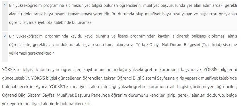 Bir yükseköğretim programından mezun olan veya bir yükseköğretim programında yukarıda adı geçen dersleri alıp başaran ve muafiyet talep edecek öğrencilerden, “Muafiyet Başvuru” panelinde YÖKSİS (e-devlet sorgusu) üzerinden;