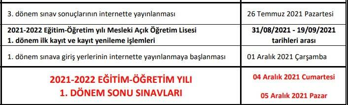 2021 MEB sınav uygulamaları takvimine göre Açık Öğretim Ortaokulu, Açık Öğretim Lisesi, Açık Öğretim İmam Hatip Lisesi ve Mesleki Açık Öğretim Lisesi- I. Dönem Sınavı 4-5 Aralık 2021 tarihinde gerçekleşecek.