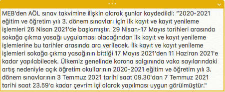 MEB Açık Öğretim Lisesi 2020-2021 eğitim ve öğretim yılı 3. dönem sınavlarının 03-04 Temmuz 2021 tarihlerinde yapılacağı belirtildi.