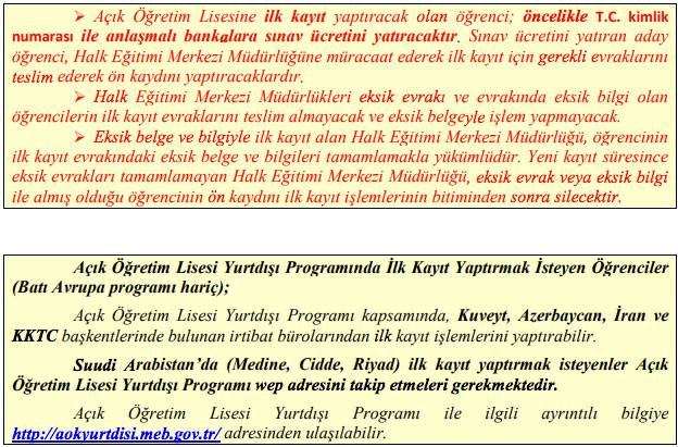 İlk kayıt için yatırılan sınav ücreti, sistem üzerinden görülmektedir. Sistemde görünmeyen ödemeler, kaydınızın gerçekleşmesini engeller. Bunun için sınav ücretinizi doğru T.C. kimlik numarasına ve hesaba yatırdığınızdan emin olunuz. T.C. Ziraat Bankası, Türkiye Halk Bankası ve Türkiye Vakıflar Bankasının internet bankacılığını kullanarak ilk kayıt sınav ücretini yatırabilirsiniz.AÇIK ÖĞRETİM LİSESİ 2021 – 2022 EĞİTİM ÖĞRETİM YILI I. DÖNEM İLK KAYIT KILAVUZU İÇİN TIKLAYIN
