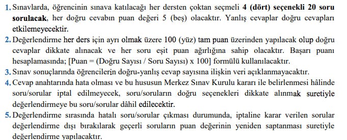 Öğrenciler, sınav süresi içinde kendilerine atanan en fazla 24 dersten sınava katılabilecekler ve atanan derslerden istedikleri dersi seçerek sınavı başlatıp bitirebileceklerdir. Sorular, soru numarası sırasında ve ekranda bir soru ve cevap seçenekleri yer alacak şekilde gösterilecektir. Seçilen derse ait sınav, “Sınava Başla” butonu ile başlatıldıktan sonra, soru sayfasında “Kaydet ve İlerle” butonu ve kalan süreyi gösteren sayaç olacak, son soruda ise “Kaydet ve İlerle” butonu yerine ‘Sınavı Bitir’ butonu olacaktır.