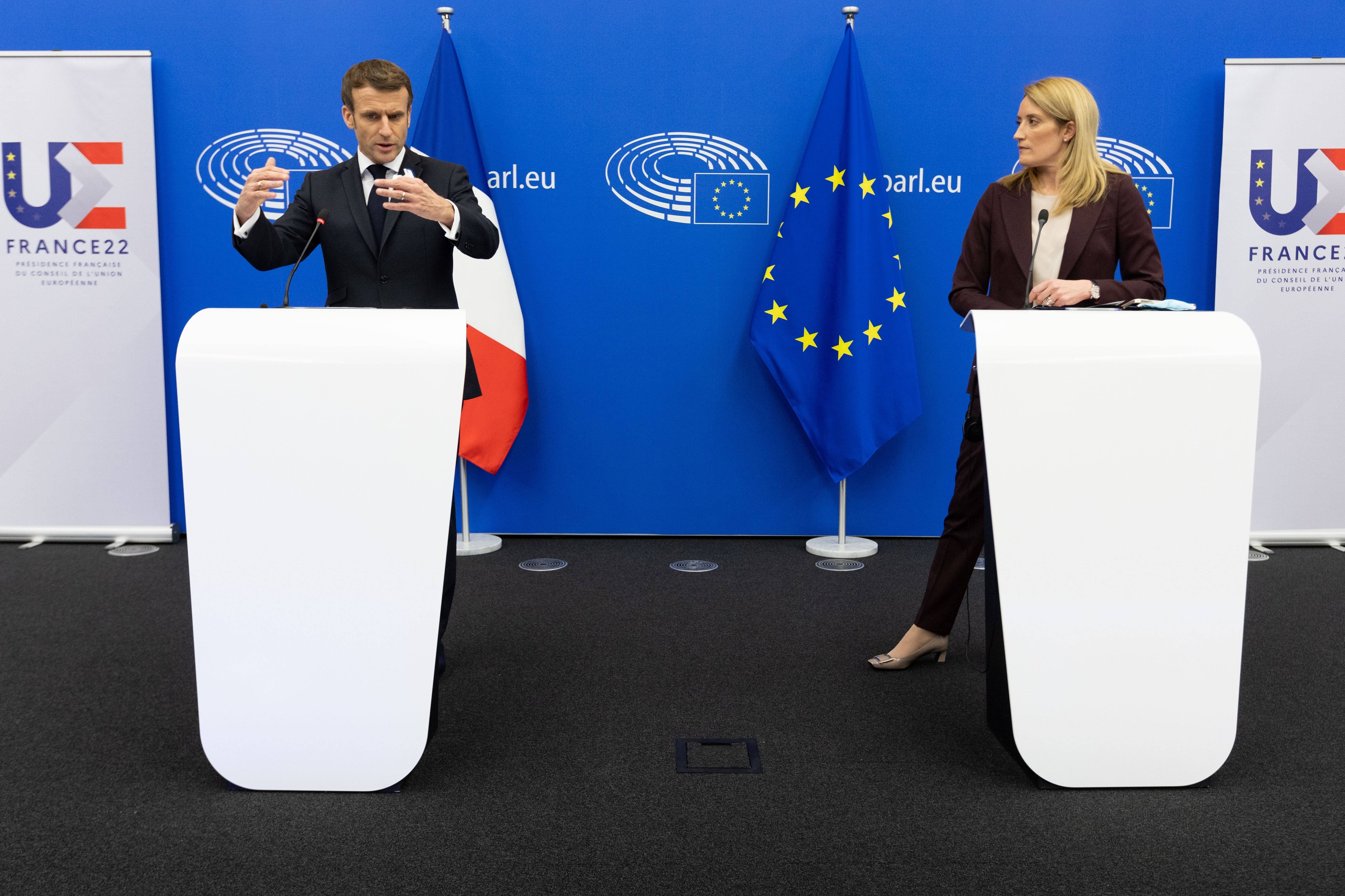 Fransa Cumhurbaşkanı Emmanuel Macron, Fransa’nın Strasbourg kentinde bulunan Avrupa Parlamentosu’nda ülkesinin Avrupa Birliği (AB) dönem başkanlığı hedeflerini açıkladıktan sonra Avrupa Parlamentosu Başkanı Roberta Metsola ile basın toplantısı düzenledi.