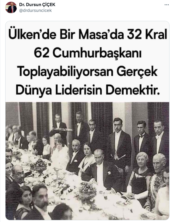 Kemalist CHP'li Dursun Çiçek, "Ülkende bir masada 32 kral 2 cumhurbaşkanı toplayabiliyorsan gerçek dünya liderisin demektir." ifadeleriyle Mustafa Kemal güzellemesi yapmak istersen fena madara oldu.