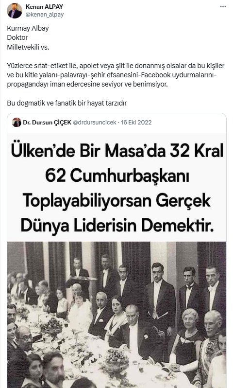 Kemalist CHP'li Dursun Çiçek sosyal medyadan yaptığı Mustafa Kemal paylaşımıyla fena madara oldu. Çiçek'in paylaşımına tepki gösterenler arasında yer alan gazeteci Kenan Alpay "Bu kişiler ve bu kitle yalanı-palavrayı-şehir efsanesini-Facebook uydurmalarını-propagandayı iman edercesine seviyor ve benimsiyor." ifadelerini kullandı.