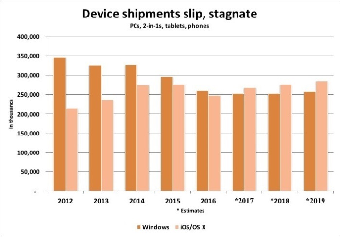 Gartner adlı araştırma firmasının yayınladığı tahminlere göre Apple toplam cihaz satışı sayısında Microsoft'u 2017 yılında yakalayıp geçebilir. 2016'da satılan 2,3 milyar cihazın yüzde 11,2'sini Windows işletim sistemi kullanan cihazlar oluştururken, Microsoft'un bu rakamları artırmakta zorlandığı görüldü. Apple'in ise son dört çeyrektir düşüş yaşamasına rağmen 2017'de yüzde 8, 2018'de yüzde 3 ve 2019'da yüzde 3 olmak üzere sürekli rakamlarını artıracağı öngörülüyor. Eğer bu öngörüler doğru çıkarsa, Apple işletim sistemi pazarında ikinci sıraya yerleşecek. Bilgisayarlara nazaran daha sık yenilenen ve gelişen özellikleri ile cezbeden akıllı telefonlarda Apple gibi şirketlerin Pazar payını artırması daha olası görünüyor.