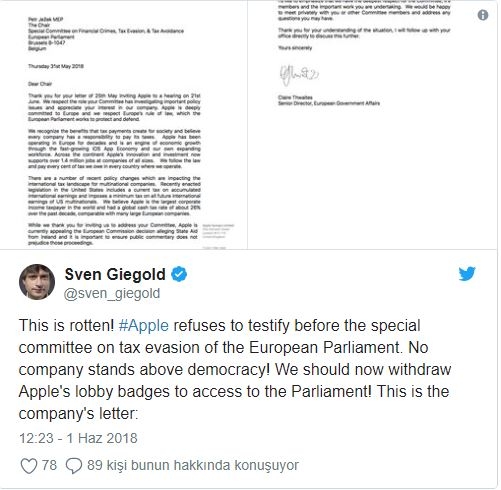 Avrupa Parlementosu'nun Almanya temsilcisi Sven Giegold'un yayınladığı ve Apple'ın Avrupa Birliği'nden gelen daveti reddettiği için oldukça sinirlendiği tweet şu şekilde: