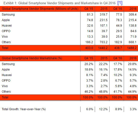 Diğer taraftan Apple cephesinde de önceki yıla oranla bir düşüş olduğu göze çarpıyor. 2015 genelinde Apple 231.5 milyon satarken, geçtiğimiz yıl bu rakam 215.4 milyona düşmüş.