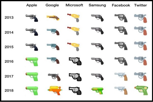 2013 yılından bu yana Apple, Google, Microsoft, Samsung, Facebook ve Twitter’ın yıl yıl emoji değişikliğini görebilirsiniz. Microsoft ve Facebook’un hala normal silah emojisi kullanıyor olması dikkat çekiyor.