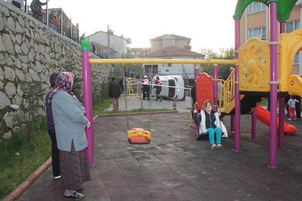 Ereğli İlçesi'nde, araba kullanmayı öğrenmeye çalışan kadın sürücünün kullandığı cip 3 metre yükseklikten çocuk parkına düştü. Kazada, sürücü ve yanındaki eşi yaralandı.