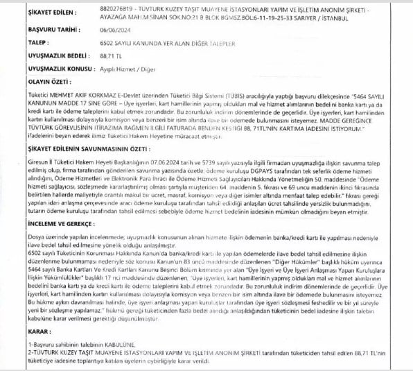 Mahkeme, bu başvuruya dayanarak, alınan hizmete ilişkin yapılan ek ödemenin hukuksuz olduğuna karar verdi. Ayrıca, 6502 sayılı Tüketicinin Korunması Hakkında Kanun'a göre kredi kartı ile yapılan ödemelerde, fazla ücret alınmasının tüketicinin haklarını ihlal ettiğine hükmetti.