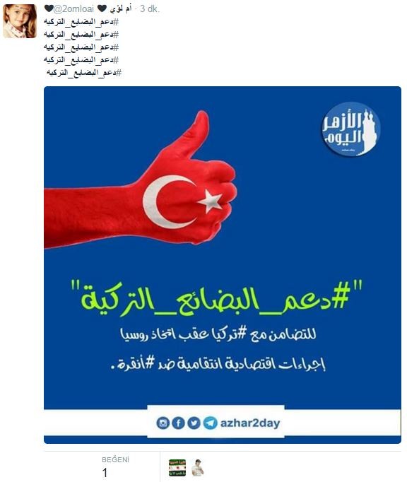 Son gelişmelerin ardından Türkiye'ye destek amacıyla düzenlenen kampanya için "Müslümanım ve Türkiye'yle dayanışma içindeyim", "Arap'ım ve Türkiye'yle dayanışma içindeyim", "Türk ürünlerine destek ol" hashtagleri kullanıldı.
