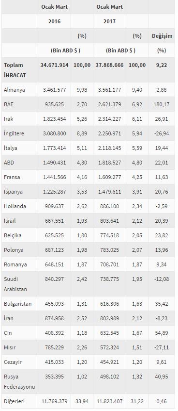 Türkiye'nin ihracatında lider ülke yine Almanya oldu. Dolar bazında ocak-mart döneminde Almanya'nın Türkiye'nin dış ticaretindeki payı (2016 aynı döneminde) yüzde 9'dan bu yıl yüzde 10'a çıktı. Birleşik Arap Emirlikleri ihracatta ikinci sırayı alırken, onu 2.3 milyar dolarlık ihracatla Irak izledi. Dördüncü sırada yer alan İngiltere'nin Türkiye'nin toplam ihracatındaki payı yüzde 8.9'dan yüzde 5.9'a geriledi. İtalya ve ABD ise sıralamada birbirini takip eden diğer iki ülke oldu.