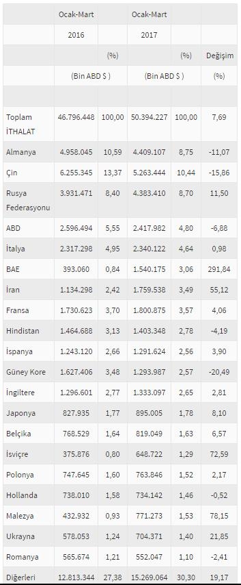 TÜRKİYE'NİN EN ÇOK İTHALAT YAPTIĞI ÜLKELER (OCAK-MART 2017)