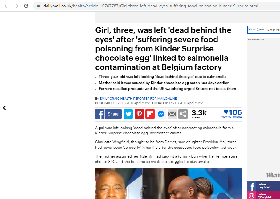 Avrupa’da birkaç ülkede salmonella salgını görülmüş, salgının Kinder Sürpriz yumurtalarıyla bağlantılı olabileceği nedeniyle yumurtalar toplatılmıştı. Öte yandan Belçika, Kinder çikolata ürünlerinde Salmonella bakterisi bulunan Ferrero şirketine ait fabrikayı geçici olarak kapatmıştı. Son olarak ise İngiltere'de yaşayan Brooklyn-Mai adlı 3 yaşındaki bir kız çocuğunun Kinder yumurta yedikten sonra hayatını kaybetmesi gündeme bomba gibi düştü. Acılı anne, kızının fotoğraflarını paylaşarak hayata nasıl gözlerini yumduğunu anlattı.