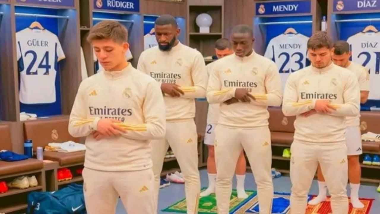 Sosyal medyada hızla yayılan fotoğrafta Arda Güler'in imamlık yaptığı görülürken namazda takım arkadaşı Antonio Rüdiger başta olmak üzere bazı Real Madridli futbolcular saf tuttu.