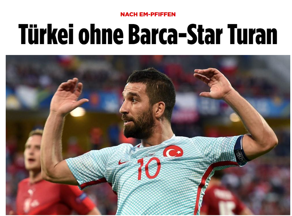 "Avrupa Şampiyonası'nda ki ıslıklamaların ardından Türkiye, Barcelona starı Arda'sız" başlığını kullanan Bild haberinde, Arda Turan'ın ilk olarak 2006 yılında milli formayla tanıştığını ve 94 defada milli formayı terlettiğini aktardı.