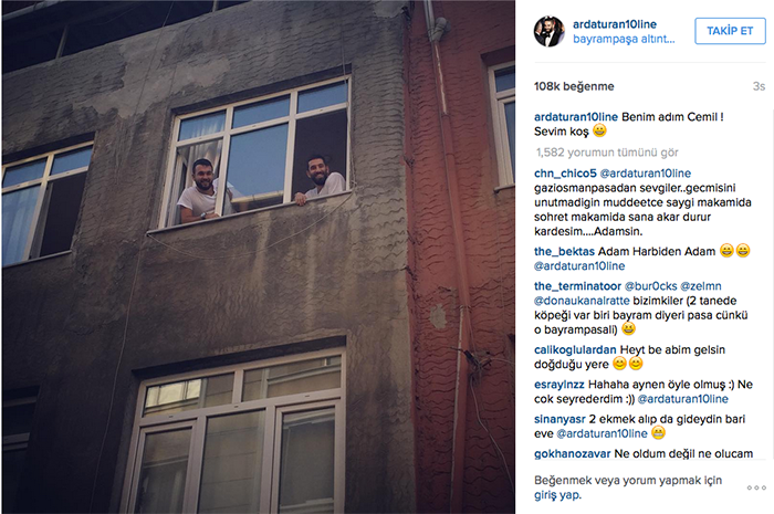 Milli yıldız Arda Turan, kardeşi Okan Turan’la birlikte eski mahallesi olan Bayrampaşa Altıntepsi’de bir evden verdiği pozu Instagram hesabından paylaştı. Kardeşiyle pencereden sarkaran poz veren Arda, fotoprafı 'Bizimkiler' dizisinin efsane karakteri ‘Cemil’in repliği olan ‘Benim adım Cemil! Sevim koş’ mesajıyla paylaştı.