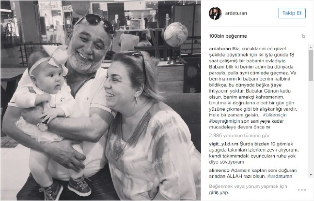 EURO 2016 D Grubu'nda Hırvatistan ve İspanya'ya mağlup olarak turnuvada henüz puan alamadığı için ağır eleştiriler alan A Milli Futbol Takımı ve performansıyla eleştirilerin hedefi olan kaptan Arda Turan, Instagram üzerinden 'Babalar Günü' paylaşımıyla prim iddialarına yanıt verdi ve mesaj gönderdi.