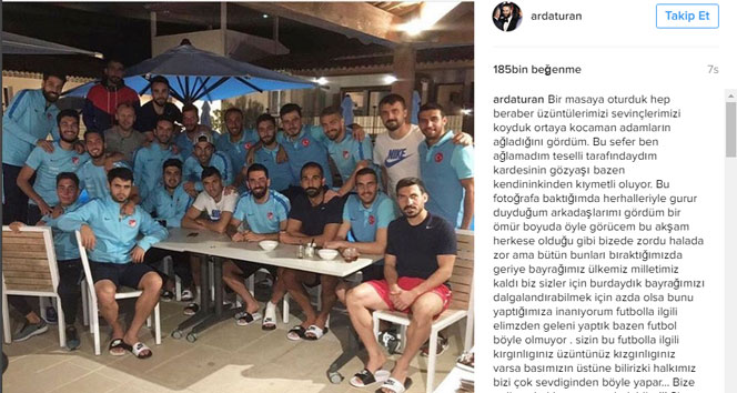 ''Bir masaya oturduk hep beraber. Üzüntülerimizi sevinçlerimizi koyduk ortaya. kocaman adamların ağladığını gördüm. Bu sefer ben ağlamadım teselli tarafındaydım kardeşinin gözyaşı bazen kendininkinden kıymetli oluyor. Bu fotoğrafa baktığımda her halleriyle gurur duyduğum arkadaşlarımı gördüm bir ömür boyu da öyle göreceğim. Bu akşam herkese olduğu gibi bize de zordu. Hala da zor ama bütün bunları bıraktığımızda geriye bayrağımız ülkemiz milletimiz kaldı biz sizler için buradaydık. Bayrağımızı dalgalandırabilmek için az da olsa bunu yaptığımıza inanıyorum. Futbolla ilgili elimizden geleni yaptık. Bazen futbol böyle olmuyor. Sizin bu futbolla ilgili kırgınlığınız, üzüntünüz, kızgınlıgınız varsa başımızın üstüne. Biliriz ki halkımız bizi çok sevdiğinden böyle yapar... Bize gelince hakkımız varsa helaldir...!!! Siz her şeyin en güzelini hakediyorsunuz benim güzel ülkem... İyi geceler, hayırlı sahurlar.''