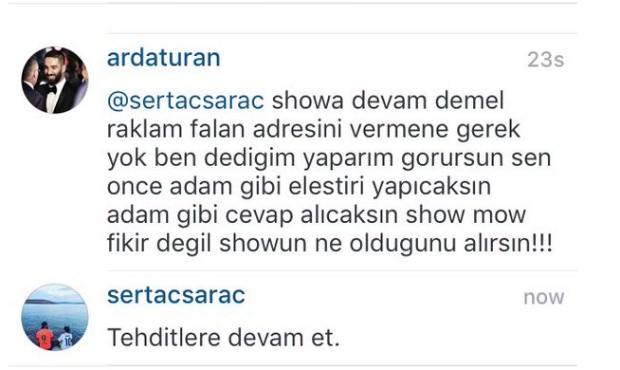 Bu sözlere sert tepki veren Arda Turan, "Seni bulacağım, şov nasıl göreceksin" cevabını verdi. Bu sözlere Sertaç Saraç "Bulmana gerek yok. Eşkıyalık taslayacaksan adresimi veririm. Çok şükür Allah'tan başka kimseden korkumuz yok." sözleriyle yanıt verdi.