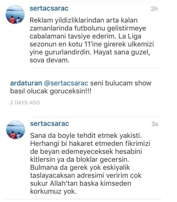 Arda Turan'ın Instagram hesabında paylaştığı bir fotoğrafa yorum yapan Sertaç Saraç adlı bir takipçisi "Reklam yıldızlıklarından arta kalan zamanlarında futbolunu geliştirmeye çabalamanı tavsiye ederim. La Liga sezonunun en kötü 11'ine girerek ülkemizi yine gururlandırdın. Hayat sana güzel şova devam" diye yazdı.
