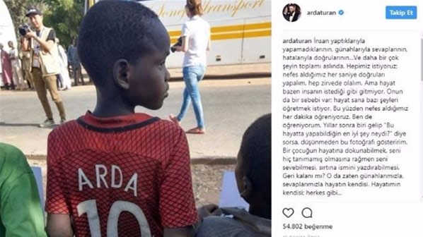 Arda Turan, ”İnsan yaptıklarıyla yapamadıklarının, günahlarıyla sevaplarının, hatalarıyla doğrularının...Ve daha bir çok şeyin toplamı aslında. Hepimiz istiyoruz; nefes aldığımız her saniye doğruları yapalım, hep zirvede olalım. Ama hayat bazen insanın istediği gibi gitmiyor. Onun da bir sebebi var; hayat sana bazı şeyleri öğretmek istiyor. Bu yüzden nefes aldığımız her dakika öğreniyoruz. Ben de öğreniyorum. Yıllar sonra biri gelip "Bu hayatta yapabildiğin en iyi şey neydi?" diye sorsa, düşünmeden bu fotoğrafı gösteririm. Bir çocuğun hayatına dokunabilmek, seni hiç tanımamış olmasına rağmen seni sevebilmesi, sırtına ismini yazdırabilmesi. Geri kalanı mı? O da zaten günahlarımızla, sevaplarımızla hayatın kendisi. Hayatımın kendisi; herkes gibi...” ifadesini kullandı.