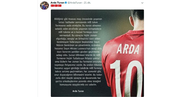 Arda Turan, A Milli Takım'a dönmesiyle ilgili Twitter hesabından yaptığı paylaşımda şu ifadeleri kullandı: