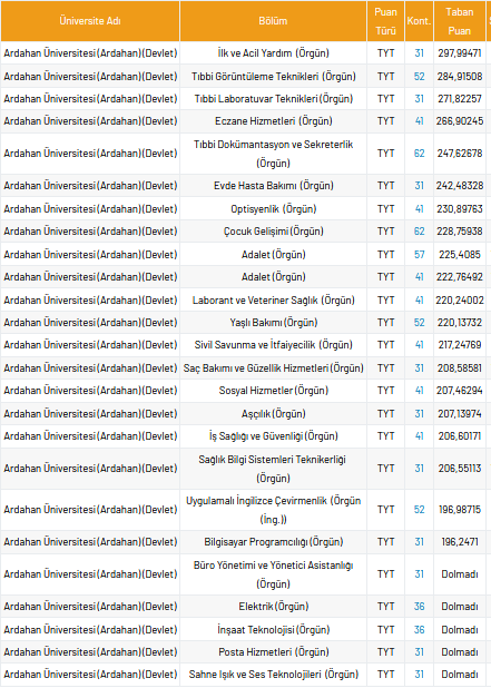 Ardahan Üniversitesi 2021 taban puanları, yüzdelik dilimleri ve kontenjan sayıları