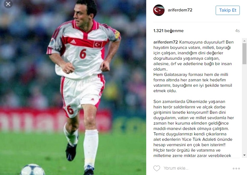 A Milli Futbol Takımı'nın ve Galatasaray'ın eski futbolcusu Arif Erdem'in konuyla ilgili sosyal medya hesabından yaptığı açıklama şöyle: