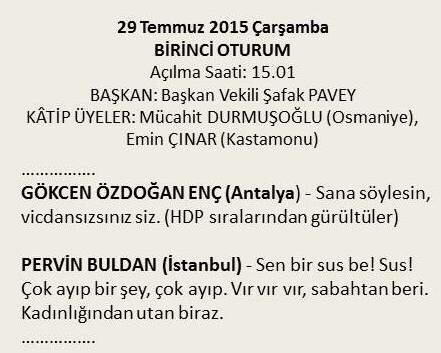 Arınç'ın konuşmasına sinirlenen HDP'li vekil Pervin Buldan'ın Ak Partili kadın vekile sözlü saldırıda bulunduğu ortaya çıktı. Meclis tutanaklarına yansıyan olayda HDP İstanbul milletvekili Pervin Buldan, Ak Parti Antalya milletvekili Gökçen Özdoğan Enç'e hakaret içeren sözler kullanıyordu.