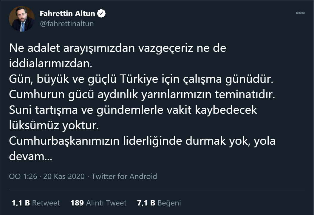 "Ne adalet arayışımızdan vazgeçeriz ne de iddialarımızdan. Gün, büyük ve güçlü Türkiye için çalışma günüdür. Cumhurun gücü aydınlık yarınlarımızın teminatıdır. Suni tartışma ve gündemlerle vakit kaybedecek lüksümüz yoktur. Cumhurbaşkanımızın liderliğinde durmak yok, yola devam..."
