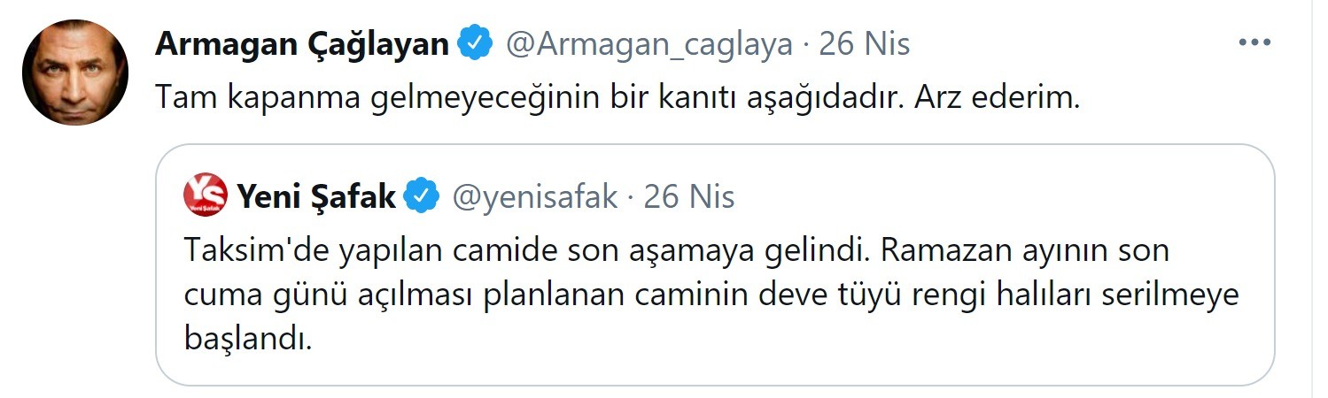 ‘Taksim'de yapılan camide son aşamaya gelindi. Ramazan ayının son cuma günü açılması planlanan caminin deve tüyü rengi halıları serilmeye başlandı’ başlıklı bir haberi alıntılayan Armağan Çağlayan, “Tam kapanma gelmeyeceğinin bir kanıtı” paylaşımını yaptı. Taksim Camii’ni açıkça hedef alan Çağlayan’ın Cumhurbaşkanı Recep Tayyip Erdoğan’ın ‘tam kapanma’ kararı sonrası kirli algısı çöktü.