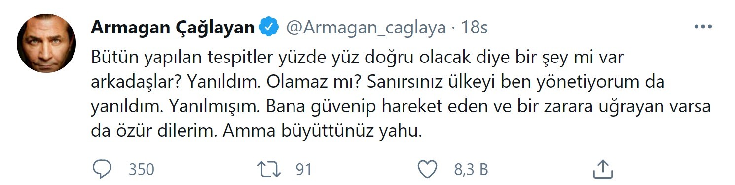 Gelen tepkilerin ardından bir açıklama daha yapan Çağlayan, “Bütün yapılan tespitler yüzde yüz doğru olacak diye bir şey mi var arkadaşlar? Yanıldım. Olamaz mı? Sanırsınız ülkeyi ben yönetiyorum da yanıldım. Yanılmışım. Bana güvenip hareket eden ve bir zarara uğrayan varsa da özür dilerim. Amma büyüttünüz yahu” dedi.