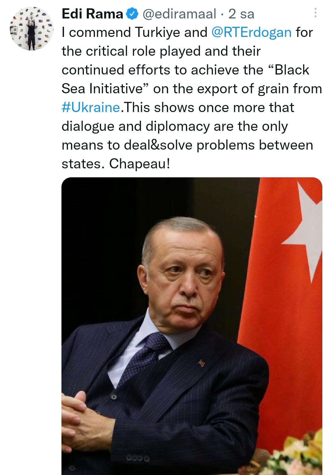 Arnavutluk Başbakanı Edi Rama resmi sosyal medya hesabından gece 22:53'te Cumhurbaşkanı Recep Tayyip Erdoğan'ın fotoğrafını yayınlayarak bir de mesaj ekledi.