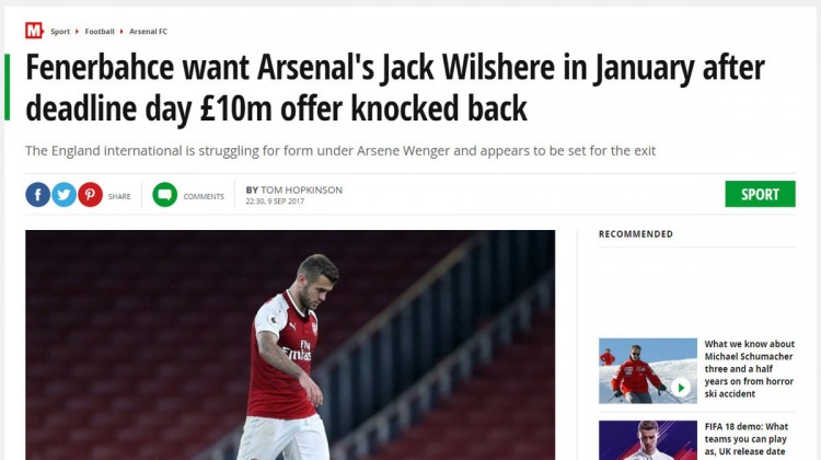 Daily Mirror'ın iddiasına göre Fenerbahçe, transferin son gününde Arsenalli yetkililere Jack Wilshere için olan teklifini iletti. Arsenal, Fenerbahçe cephesinden gelen 11 milyon Euro'luk bu teklifi kabul etmedi. Bu cevabın ardından 'satın alma' teklifini 'kiralama' şekline çeviren Fenerbahçe'nin bu teklifi de Arsenal tarafından kabul görmedi. Fenerbahçe'nin bu transferden vazgeçmediği ve Wilshere'ı transfer etmek için devre arasında bir girişim daha yapacağı haberin detaylarında yer alan en önemli bilgi oldu.