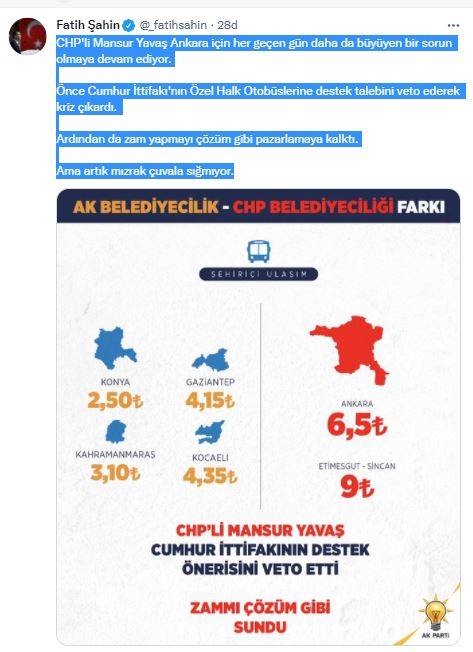 Resmi sosyal medya hesabından paylaşımda bulunan AK Parti Genel Sekreteri, Ankara Milletvekili Fatih Şahin, “CHP'li Mansur Yavaş Ankara için her geçen gün daha da büyüyen bir sorun olmaya devam ediyor. Önce Cumhur İttifakı'nın Özel Halk Otobüslerine destek talebini veto ederek kriz çıkardı. Ardından da zam yapmayı çözüm gibi pazarlamaya kalktı. Ama artık mızrak çuvala sığmıyor” ifadelerini kullandı.