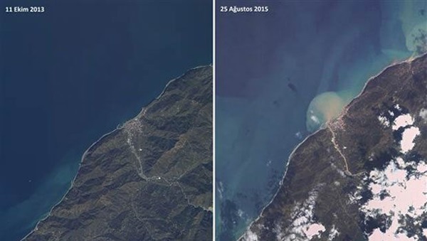 RASAT uydusuyla 11 Ekim 2013 ve 25 Ağustos 2015'te çekilen iki ayrı fotoğrafta, selin Arhavi ilçesine etkisi fark ediliyor. Görüntüde sel sularıyla iç kesimlerden taşınan toprağın denize ne boyutta karıştığı görülebiliyor.